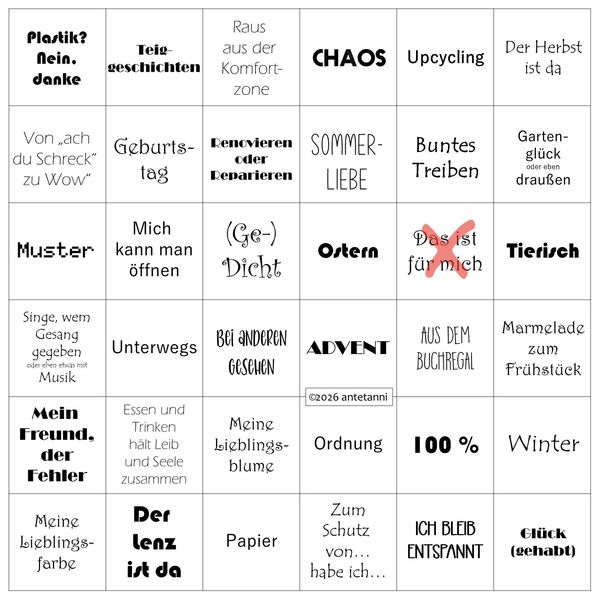 Tja, und da ich hier mal wieder mit einem ganz neuen Blog starte, fange ich auch mit meinem Jahresbingo nochmal von vorne an. Regeln sind Regeln :-) Aber das Jahr ist noch lang, es werden noch viele Kreuzchen dazu kommen ;-))) Für heute gibt es ein Kreuzchen bei "Das ist für mich".