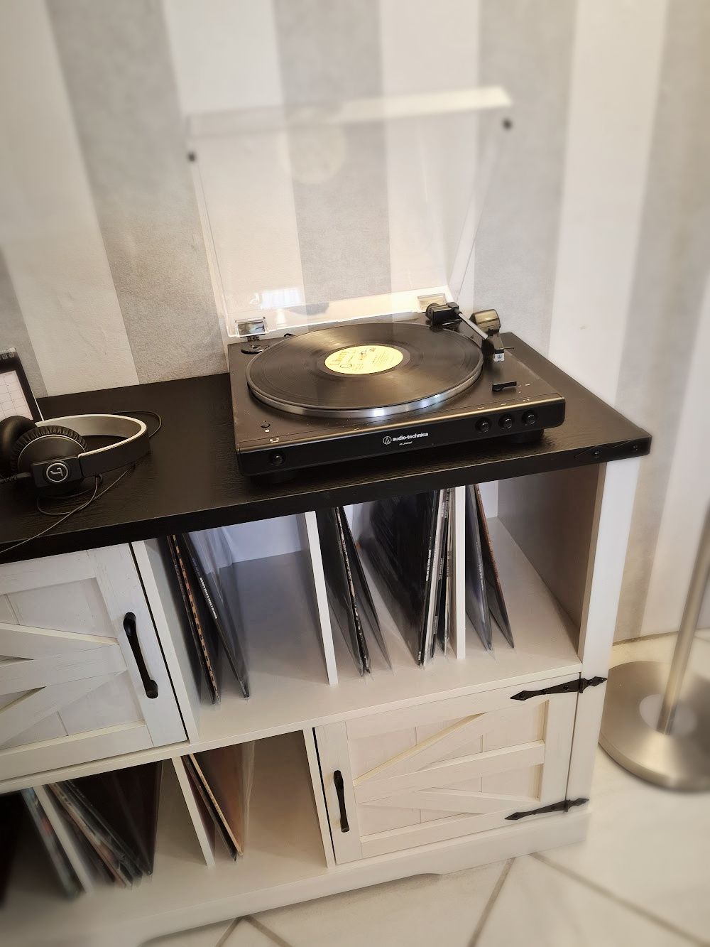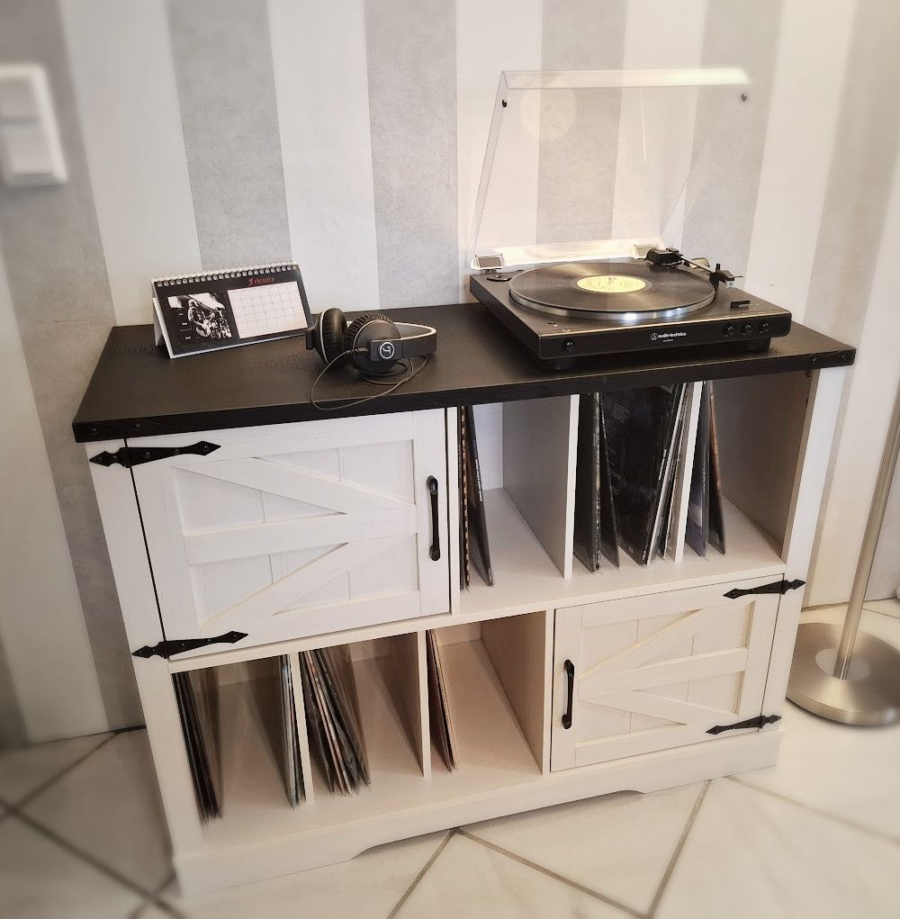 Ich bin ja seit einiger Zeit wieder unter die Vinyl-Sammler gegangen und im Zuge unserer Wohnzimmerumgestaltung wollte ich so gerne einen Schrank für meine Schallplatten bzw. den Schallplattenspieler und das Zubehör haben. Am allerliebsten aber im Farmhouse Style, passend zum Rest der Einrichtung. Und was soll ich sagen: nach ein bißchen online-Recherche bin ich fündig geworden und habe diesen schönen Schrank entdeckt! Auf den ersten Blick hatte ich mich in die Türen mit den schönen schwarzen Eisenbeschlägen verliebt!