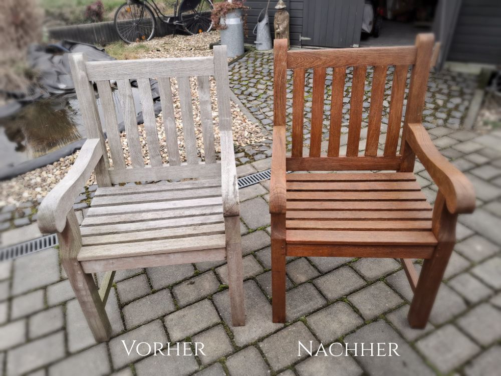 Mein erstes gestrichenes Stück in diesem Jahr ist ein einzelner Teak Stuhl (siehe Foto oben, dank Virus und Eiseskälte draußen bin ich noch nicht zu mehr gekommen) und der war auch schon ganz schön kniffelig zu streichen mit seinen ganzen Streben. Hat man vorne gestrichen, liefen auf der Rückseite die Farb-Nasen nur so runter... lach! Abgesehen davon werde ich mich nochmal für einen komplett anderen Farbton entscheiden. Mir ist der erste Stuhl viel zu rötlich-braun geworden, das gefällt mir garnicht.