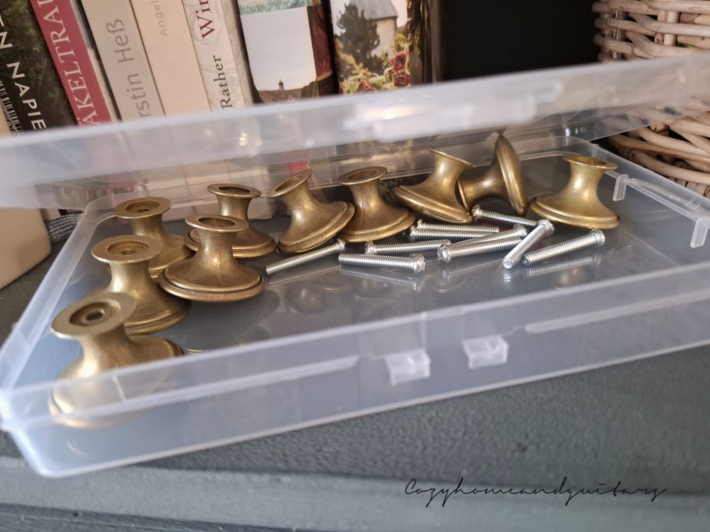 Im Hof wartet nun noch eine Vitrine auf mich, die ebenfalls in "Tabernas" gestrichen werden soll - jedoch soll sie auch so bleiben (ohne "whitewash") und wird dann sicherlich sehr edel wirken! Die Vitrine wird zudem noch mit antik matt goldenen Knöpfen (zwei davon hat der Dielenschrank auch an seine Schublade unten bekommen) und Muschelgriffen versehen. Ich werde Euch bestimmt wieder Vorher-Nachher Bilder zeigen.
