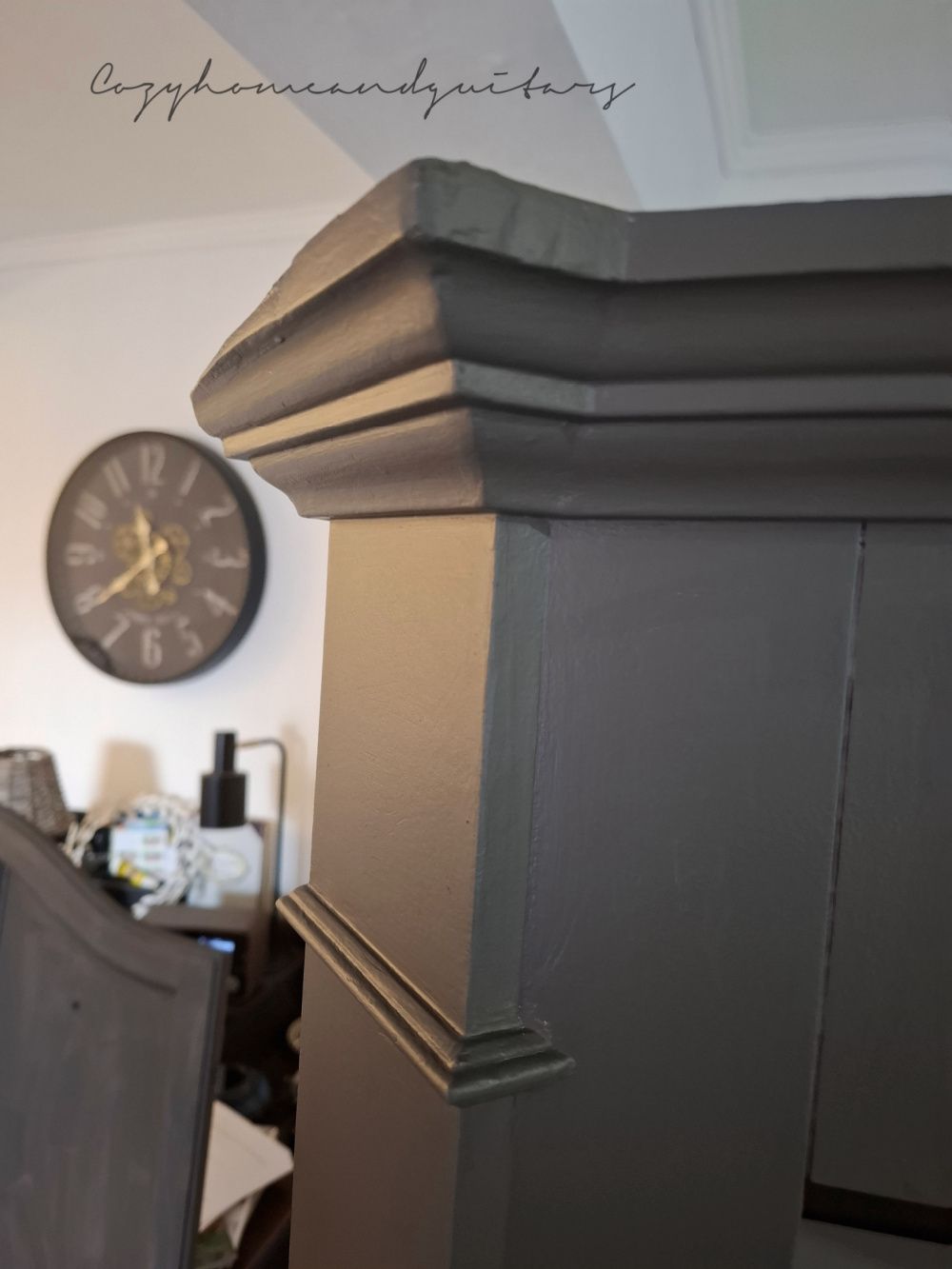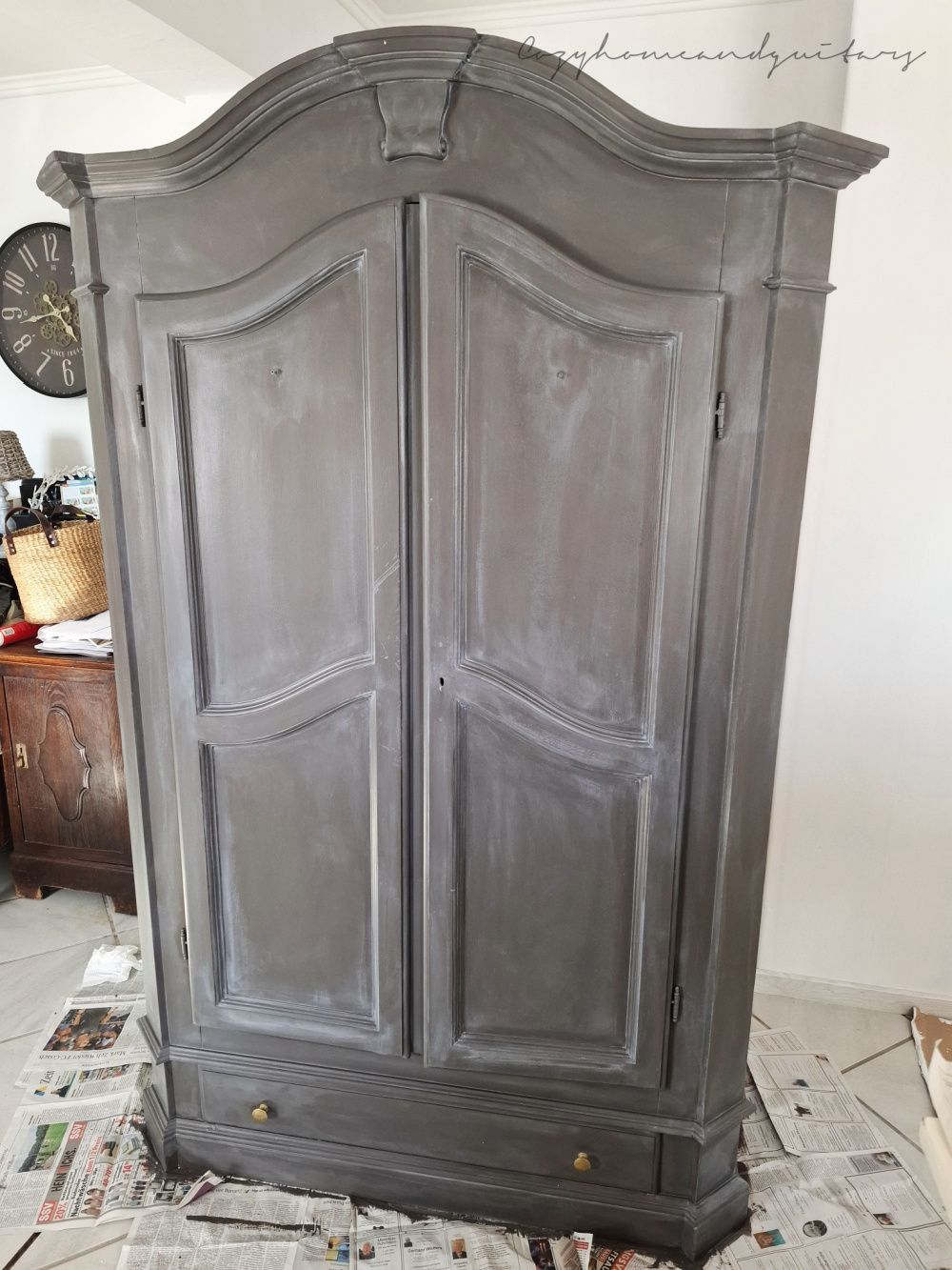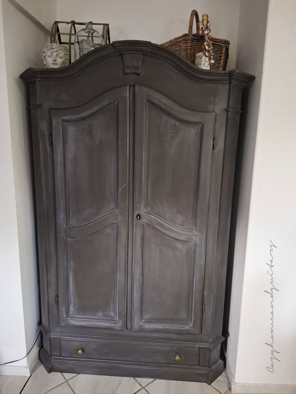Zuerst musste er gut geschliffen werden, denn ich hatte ihn damals nach dem Streichen mit weißer Kreidefarbe noch mit einer ordentlichen Klarwachs-Schicht überzogen. Die meiste Schleifarbeit hat mein lieber Mann gemacht - draußen an der frischen Luft. Als Farbton habe ich einen Buntlack mit dem klangvollen Namen "Tabernas" gewählt - ein kräftiges, erdiges dunkles grau-braun. Der Farbton ist wirklich traumhaft! Allerdings habe ich den Dielenschrank noch mit weißem Wachs bearbeitet, damit er einen ordentlichen used Look bekommt und man sieht von dem schönen "Tabernas" nicht mehr viel - er wirkt jetzt eher dunkelgrau, aber nicht minder schön!